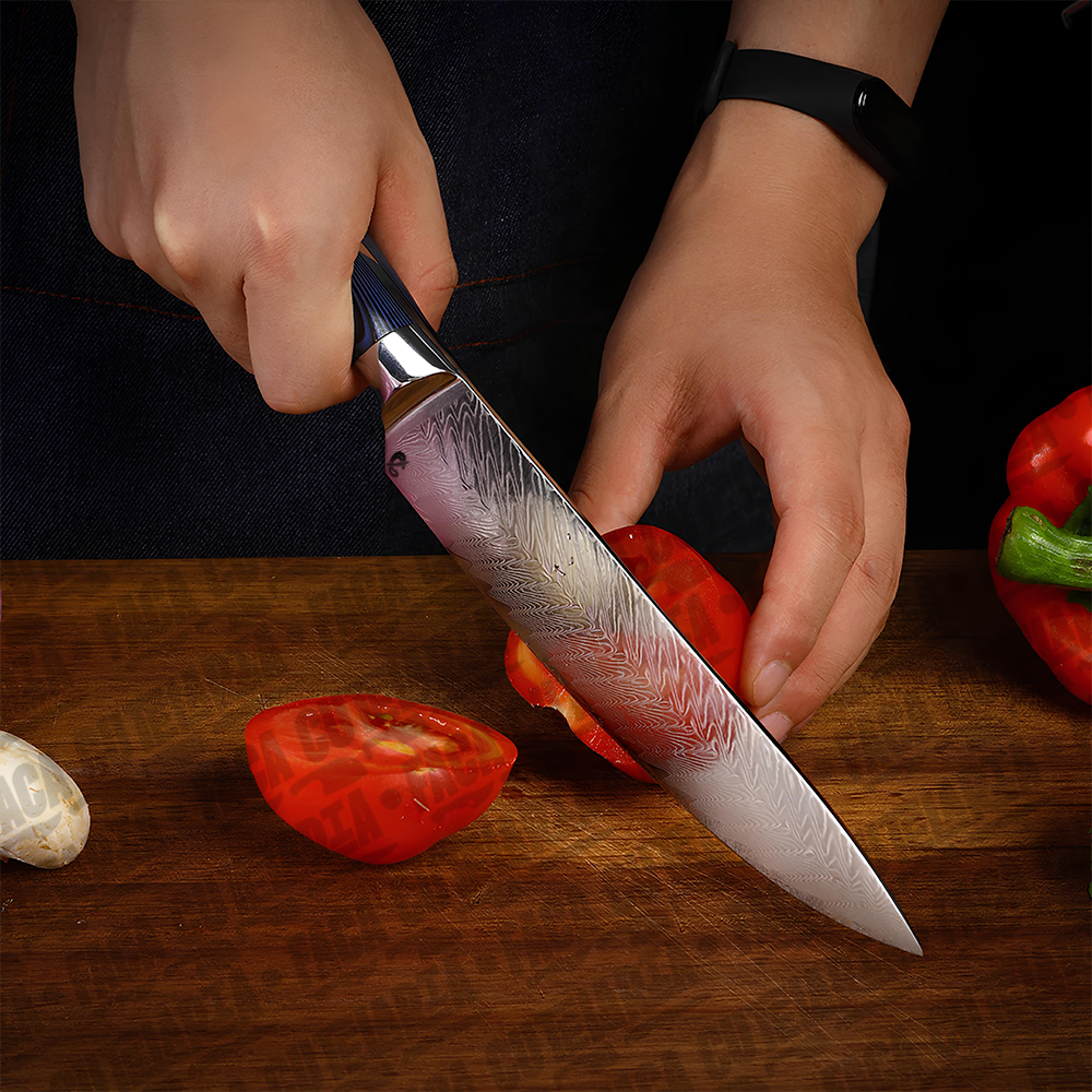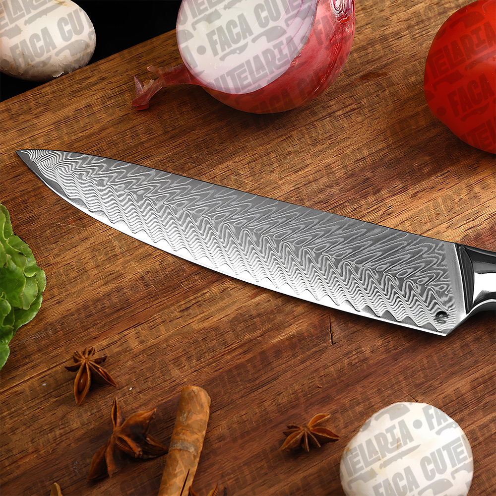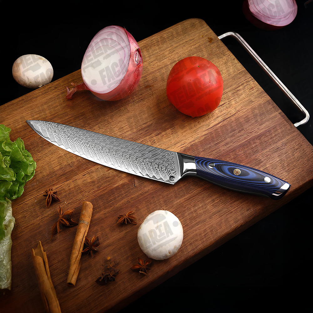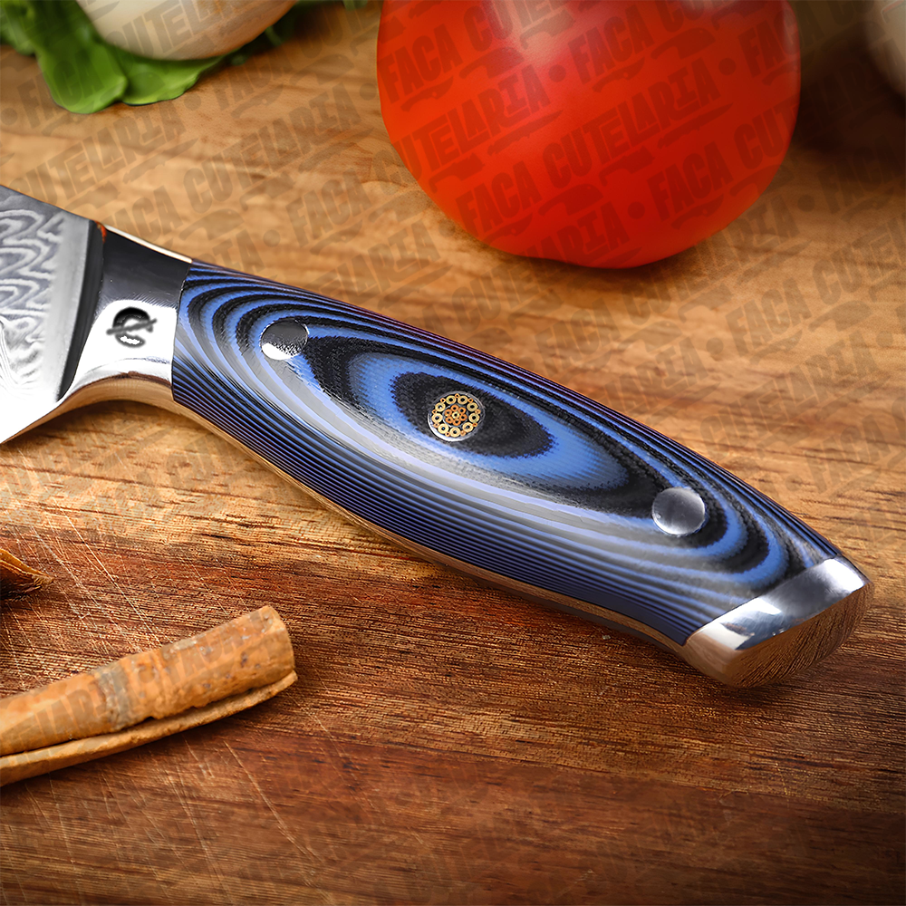 ESPECIFICAÇÕES: Comprimento total: 32,7 cm Comprimento da lâmina: 20,5 cm (8 polegadas) Largura da lâmina: 4 cm (na parte mais larga) Espessura da lâmina: 2 mm Peso líquido: 254g. Dureza: 60 HRC. Material da Lâmina: Aço Damasco 67 Camadas Cabo: Combinação de resina azul e madeira. Características: Afiada e durável; anti ferrugem Material do Damasco VG10: Aço 10cr15. Nível de corte: O nível de força de corte: 6.0-8.0 N.Navalha muito afiada Bônus: Bainha